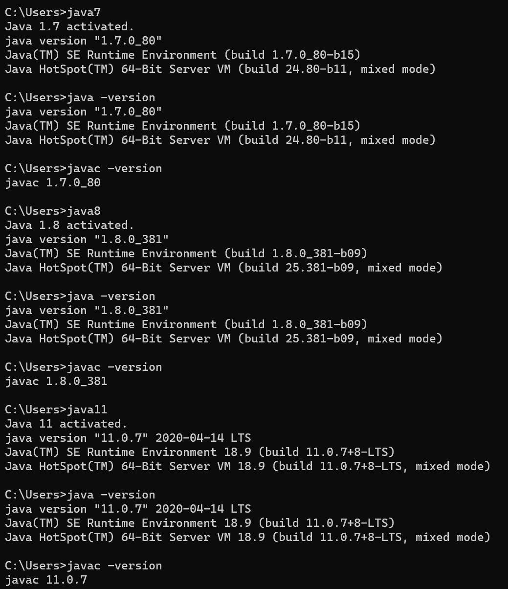| @echo off set JAVA_HOME=C:\Program Files\Java\jdk-11.0.7 set Path=%JAVA_HOME%\bin;%Path% echo Java 11 activated. java -version |
